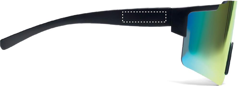 Sport-Sonnenbrille mit verspiegelten Gläsern und schwarzem Rahmen. UV400-Schutz.